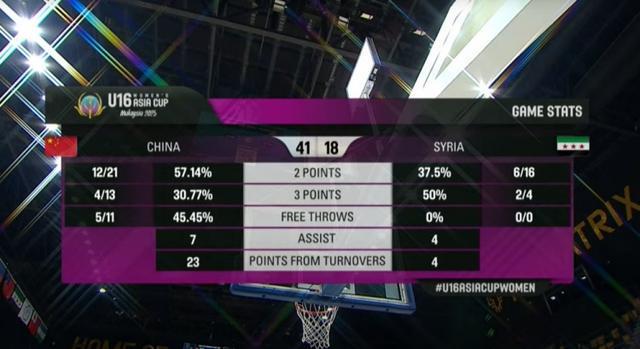 中国女篮U16半场41-18叙利亚 李沅珊开局2分钟命中三分便被换下